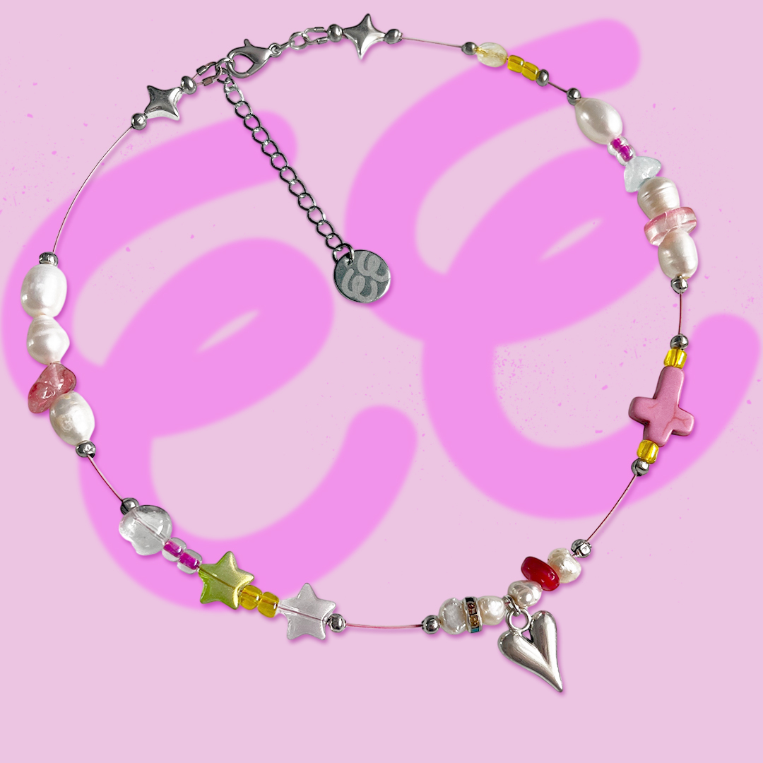 Нежный розовый тросик держит оборону, а бусины (речной жемчуг + керамика) устроили на нем творческий беспорядок. Выглядит минималистично, весит как пушинка, стоит дешевле, чем ужин в кафе. Идеально для тех, кто любит, когда красиво и не как у всех