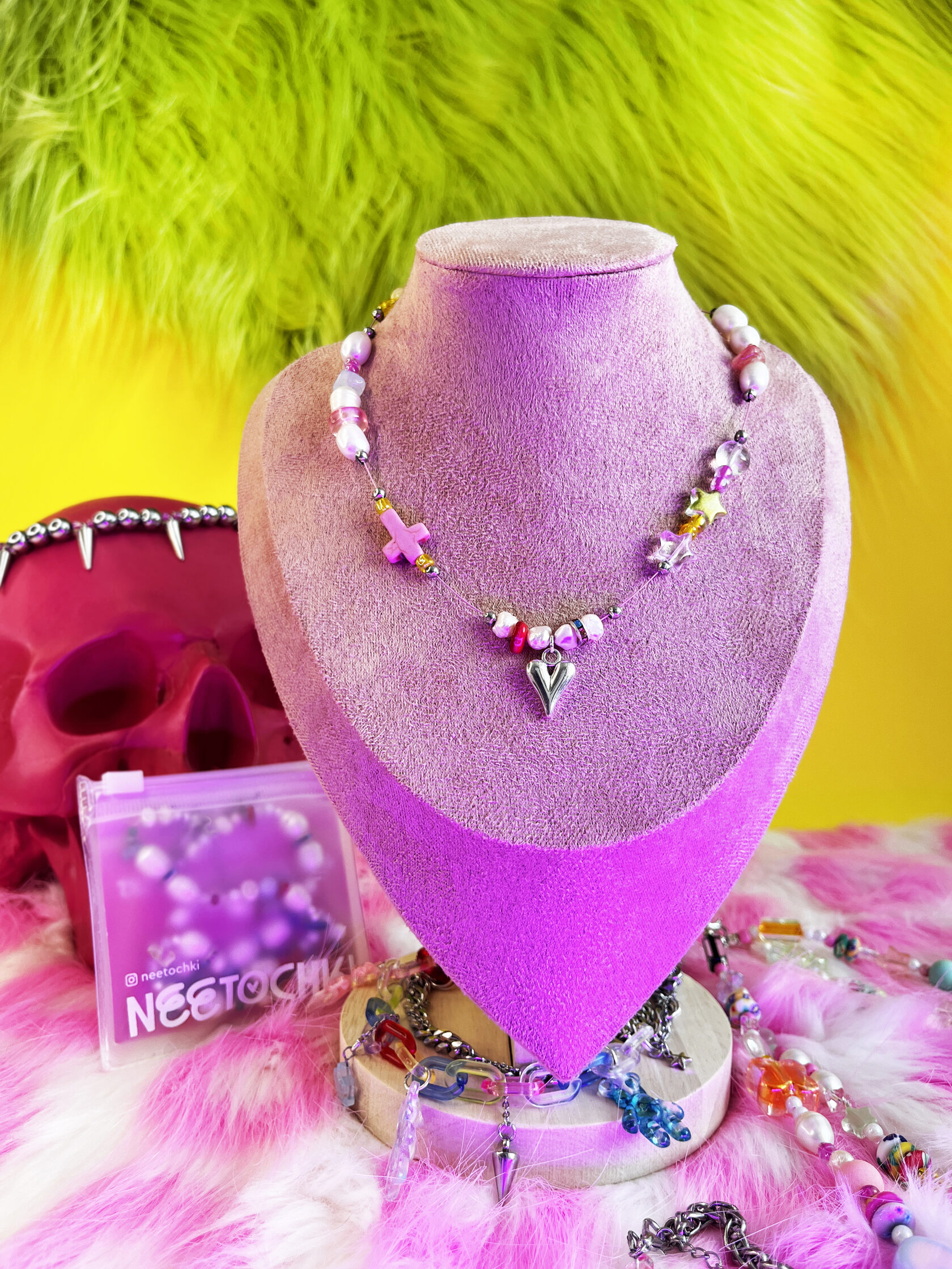 ЧТО ТУТ ОСОБЕННОГО? ✔ 87 ГРАММ: асимметричная база из металлических бусин на металлическом тросике. Увесисто, но комфортно. ✔ СТЕКЛО И ШИПЫ: необычное сочетание, но смотрится клёво! А ещё этот розовый мармеладный медведь... ✔ ТВОЙ ТЕКСТ — ТВОИ ПРАВИЛА: уникальная фишка — добавь к колье свой текст в формате бусин. Такое колье только у тебя и у Майкла Джексона.